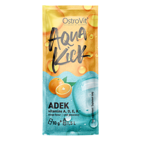 OstroVit Aqua Kick ADEK to suplement diety, który stanowi źródło witamin rozpuszczalnych w tłuszczach, takich jak witamina A, witamina D oraz witamina E i K. To nowoczesny preparat o wyjątkowym, pomarańczowym smaku, który jest dostępny w wygodnej formie saszetki. To produkt stworzony z myślą o osobach aktywnych fizycznie, który umożliwia bezproblemową podaż wartościowych mikroskładników.
