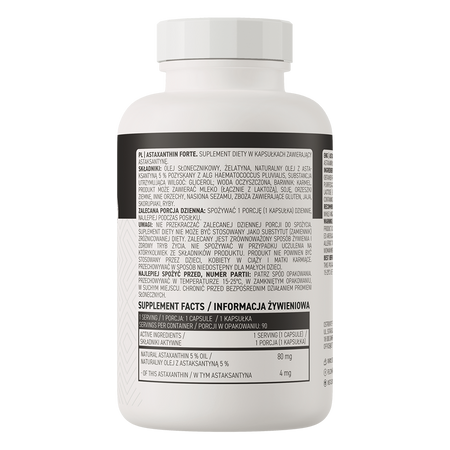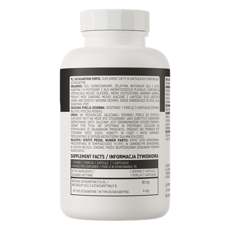 - Źródło astaksantyny - jedna porcja suplementu diety dostarcza do organizmu 80 mg naturalnego oleju z astaksantyną, który zawiera 4 mg cennego związku.