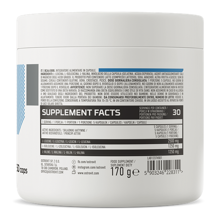 OstroVit BCAA 5000 mg to wysokiej jakości suplement diety, który stanowi źródło aminokwasów rozgałęzionych. To preparat o prostym składzie, dostępny w formie łatwych do połknięcia kapsułek. To produkt stworzony z myślą o sportowcach i osobach aktywnych fizycznie, którym zależy na uzupełnieniu diety w cenne aminokwasy.