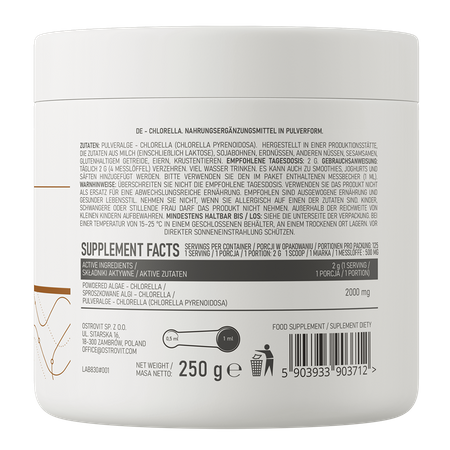 OstroVit Chlorella to wysokiej jakości suplement diety, który stanowi źródło sproszkowanych alg, takich jak chlorella. To wegański preparat, dostępny w łatwej w użyciu formie proszku. To produkt stworzony z myślą o osobach, którym zależy na uzupełnieniu codziennej diety w wartościowe składniki.