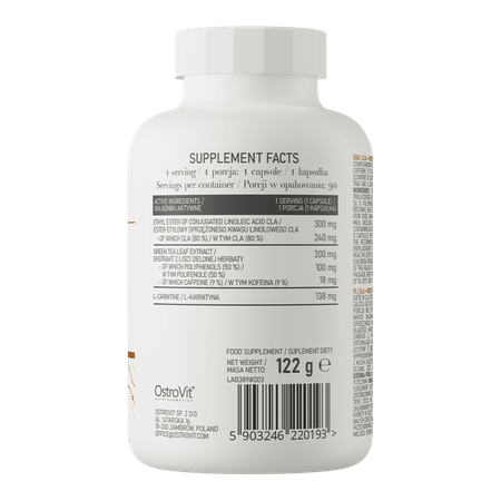 - Źródło wartościowych związków - jedna porcja suplementu diety dostarcza do organizmu 300 mg estru etylowego sprzężonego kwasu linolowego CLA, a także 200 mg ekstraktu z liści zielonej herbaty standaryzowanego na 50% polifenoli i 9% kofeiny oraz 138 mg L-karnityny.