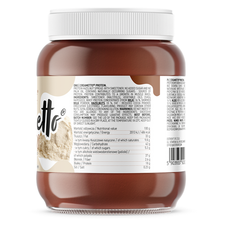 OstroVit Creametto Protein to proteinowy krem orzechowy, który stanowi słodką alternatywę dla wysokoenergetycznych produktów tego typu. To krem wyróżniający się bogactwem wysokiej jakości białka, a także zawartością cennych tłuszczów roślinnych i niskokalorycznej substancji słodzącej, jaką jest maltitol. To smaczny dodatek do dań, który doskonale sprawdzi się jako smarowidło do naleśników, urozmaicenie gofrów czy pasta do kanapek. OstroVit Creametto Protein można wykorzystać również podczas przygotowywania posiłków okołotreningowych oraz różnego rodzaju ciast i deserów.