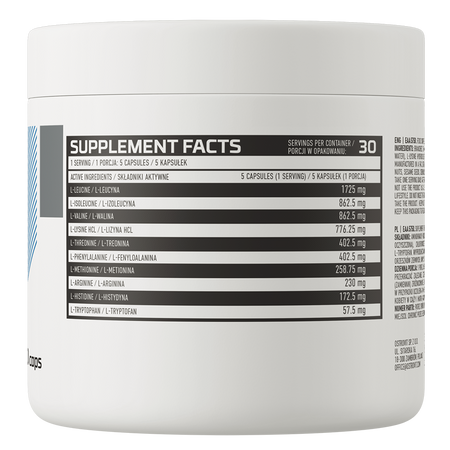 - Źródło cennych aminokwasów - jedna porcja suplementu diety dostarcza do organizmu 1725 mg L-leucyny, 862,5 mg L-izoleucyny, 862,5 mg L-waliny, a także 776,25 mg L-lizyny HCl, 402,5 mg L-treoniny oraz 402,5 mg L-fenyloalaniny. Dodatkowo porcja preparatu zawiera 258,75 mg L-metioniny, 230 mg L-argininy, 172,5 mg L-histydyny oraz 57,5 mg L-tryptofanu.