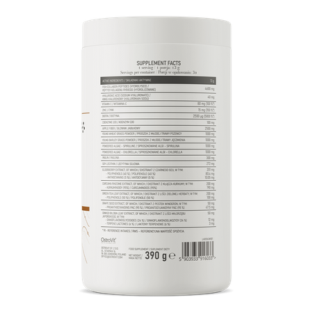 - Bogactwo wartościowych związków - preparat dostarcza do organizmu kolagen rybi, kwas hialuronowy, witaminę C oraz cynk, biotynę i koenzym Q10. Produkt zawiera też błonnik jabłkowy, proszek z młodej trawy pszenicy, proszek z młodej trawy jęczmienia, a także spirulinę, chlorellę, inulinę i lecytynę sojową.
