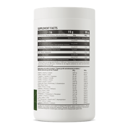 - Źródło białka - jedna porcja suplementu diety dostarcza do organizmu 26 g protein w postaci izolatu białka grochu.