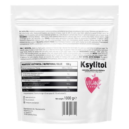 OstroVit Ksylitol to wysokiej jakości produkt, który zawiera alkoholowy cukier, który może być beztrosko używany jako substytut cukru białego (sacharozy). Naturalnie występuje w niektórych owocach, warzywach oraz innych roślinach np. korze brzozy.