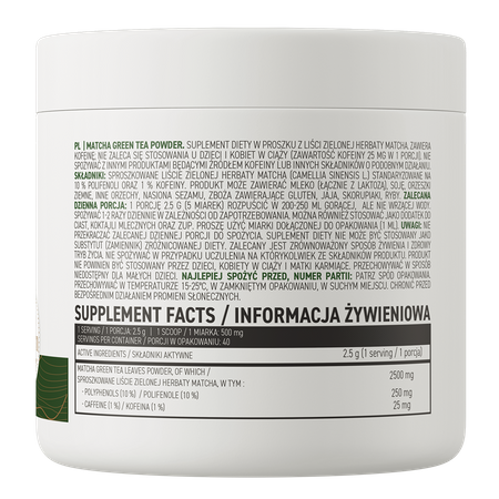 - Jedna porcja suplementu diety dostarcza do organizmu 2500 mg sproszkowanych liści zielonej herbaty matcha standaryzowanej na 10% polifenoli i 1% kofeiny.