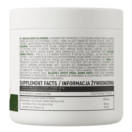 - Jedna porcja suplementu diety dostarcza do organizmu 2500 mg sproszkowanych liści zielonej herbaty matcha standaryzowanej na 10% polifenoli i 1% kofeiny.