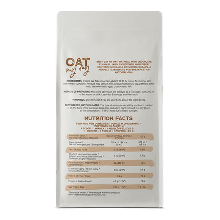 OstroVit Oat My Day to pożywna owsianka, która wyróżnia się bogactwem błonnika pokarmowego. Produkt nie zawiera cukru dodanego, a słodki smak zawdzięcza kawałkom naturalnych, liofilizowanych owoców oraz niskoenergetycznej substancji słodzącej, jaką jest sukraloza. Dostępna w czterech różnych wariantach smakowych mieszanka to rozwiązanie, które zaspokoi apetyt i indywidualne preferencje konsumenta, a prostota i krótki czas potrzebny na przygotowanie posiłku umożliwią delektowanie się smaczną i zdrową przekąską nawet podczas intensywnego dnia.