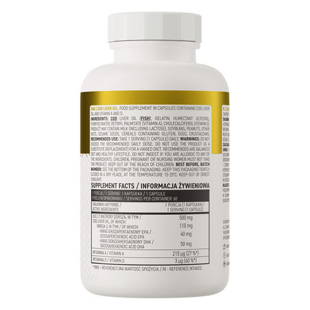 - Źródło oleju z wątroby dorsza - jedna porcja suplementu diety dostarcza do organizmu 500 mg związku.