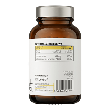OstroVit Pharma Colostrum Wołowe to wysokiej jakości suplement diety, który stanowi źródło suszonej siary bydlęcej zawierającej 30% immunoglobulin G. To preparat z elitarnej linii OstroVit Pharma, dostępny w postaci łatwych do połknięcia kapsułek, stworzony z myślą o świadomych konsumentach, którym zależy na wsparciu pracy organizmu.