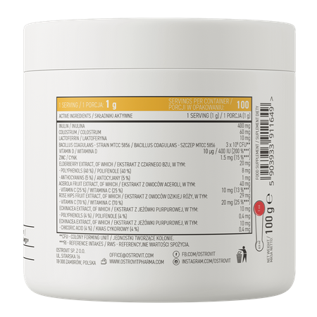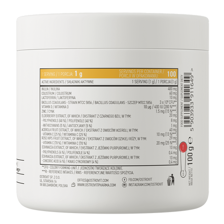 - Bogactwo ekstraktów roślinnych, prebiotyków i białek - suplement diety zawiera inulinę, colostrum, laktoferynę, a także bacillus coagulans. Dodatkowo w produkcie można znaleźć ekstrakt z czarnego bzu, ekstrakt z owoców aceroli czy owoców dzikiej róży, a także ekstrakt z jeżówki purpurowej.
