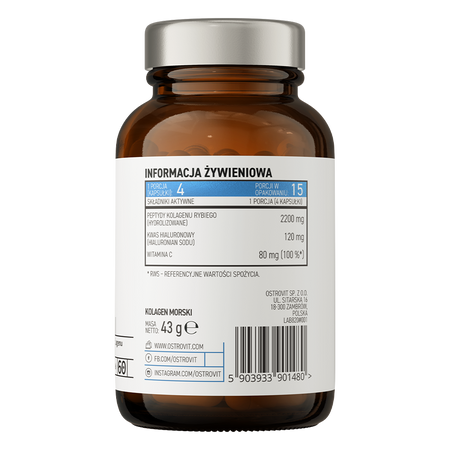 OstroVit Pharma Kolagen morski to suplement diety, który stanowi cenne źródło kolagenu morskiego typu I, czyli formy związku, która wyróżnia się świetną wchłanialnością w ludzkim organizmie. To preparat wzbogacony również w kwas hialuronowy i witaminę C, dostępny w formie łatwych do połknięcia kapsułek. To produkt z elitarnej linii OstroVit Pharma, stworzony z myślą o sportowcach i osobach dbających o zdrowy i piękny wygląd.