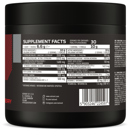 - Źródło wartościowych składników - jedna porcja suplementu diety dostarcza do organizmu 3500 mg jabłczanu L-cytruliny, 1600 mg A-AKG, 1500 mg L-argininy, 800 mg beta-alaniny, 500 mg tauryny, a także 500 mg ekstraktu z korzenia buraka DER 4:1, 300 mg L-tyrozyny, 200 mg bezwodnej kofeiny i 150 mg ekstraktu z pestek winogron. Dodatkowo preparat zawiera 2.1 mg ekstraktu z owoców czarnego pieprzu, 80 mg witaminy C, 58 mg magnezu i 1,4 mg witaminy B6.