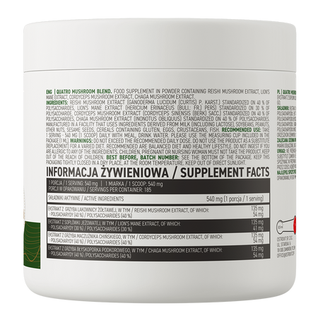 OstroVit Quatro Mushroom Blend VEGE to unikalne połączenie ekstraktów z czterech różnych grzybów - lakownicy żółtawej, soplówki jeżowatej, maczużnika chińskiego oraz błyskoporka podkorowego. To preparat dostępny w wygodnej w użyciu formie proszku, stworzony z myślą o osobach, którym zależy na uzupełnieniu diety w naturalne, cenne składniki.