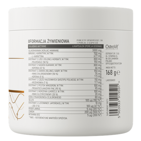 - Źródło 14 cennych związków - suplement diety dostarcza do organizmu glukomannan, winian L-karnityny, ekstrakt z zielonej herbaty, z nasion guarany i z ziaren zielonej kawy, a także ekstrakt z części naziemnych skrzypu polnego, z pestek winogron i z korzenia lukrecji. W produkcie można znaleźć też korę cynamonowca cejlońskiego, selen, ekstrakt z listownicy japońskiej oraz ryboflawinę, chrom i witaminę B12.