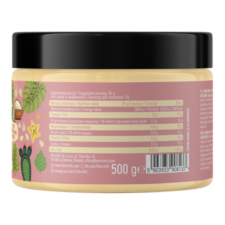 OstroVit Tahini to wysokobiałkowa pasta na bazie nasion prażonego sezamu, miodu wielokwiatowego oraz oleju MCT z dodatkiem aromatu waniliowego. Pasta wyróżnia się słodkim orientalnym smakiem oraz bogactwem naturalnych witamin i minerałów. Poszukujesz pomysłu na smaczne i zdrowe kanapki? Nie wyobrażasz sobie naleśników, owsianki czy omletu bez słodkich dodatków? Koniecznie wypróbuj naszą pastę sezamową - OstroVit Tahini o smaku waniliowym.