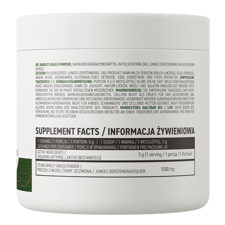 - Zawiera sproszkowaną trawę młodego jęczmienia - jedna porcja suplementu diety dostarcza do organizmu 5000 mg substancji.