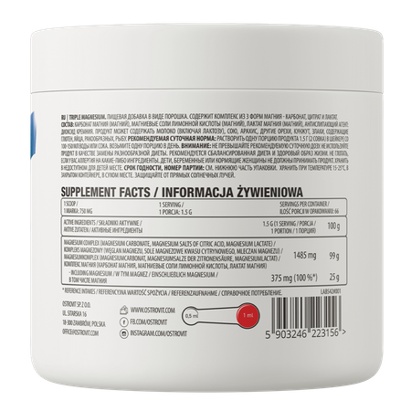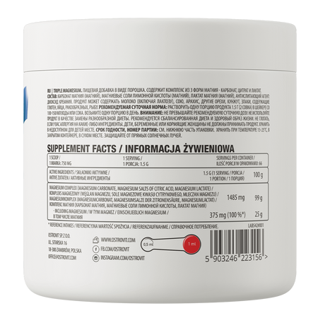 OstroVit Triple Magnesium to wysokiej jakości suplement diety, który zawiera trzy formy magnezu - cytrynian magnezu, mleczan magnezu oraz węglan magnezu. To preparat o naturalnym smaku, dostępny w postaci proszku. To produkt stworzony z myślą o świadomych konsumentach, którym zależy na uzupełnieniu codziennej diety w cenny związek.