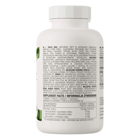 - Źródło cynku w trzech różnych formach - jedna porcja suplementu diety dostarcza do organizmu 15 mg pierwiastka - 5 mg pochodzi z glukonianu cynku, 5 mg z pikolinianu cynku oraz 5 mg z cytrynianu cynku.