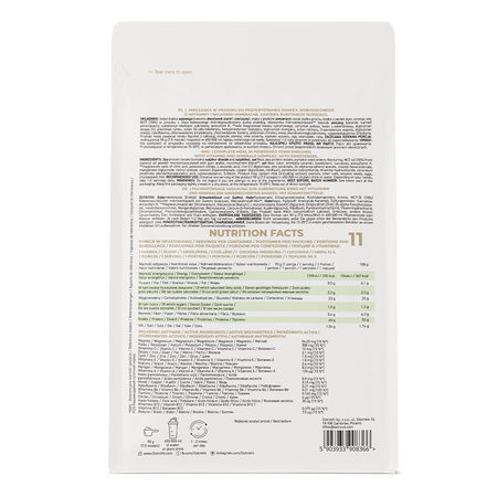 Mieszanka w proszku do przygotowania shake'a wzbogaconego o witaminy i składniki mineralne. Zawiera substancje słodzące.