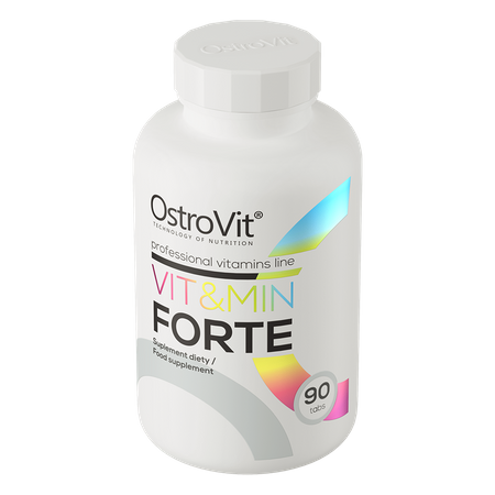 W preparacie OstroVit Vit&Min Forte znaleźć można witaminy, takie jak witamina A, witamina C, witamina E, witamina D, a także witaminy z grupy B - tiaminę, ryboflawinę, niacynę, kwas pantotenowy, witaminę B6, kwas foliowy, biotynę i witaminę B12. W suplemencie wykorzystano także cenne składniki mineralne, takie jak potas, magnez, miedź, mangan, żelazo, chrom, selen, wapń czy cynk, w wysoce biodostępnych postaciach, co pozytywnie wpływa na jakość suplementacji.
