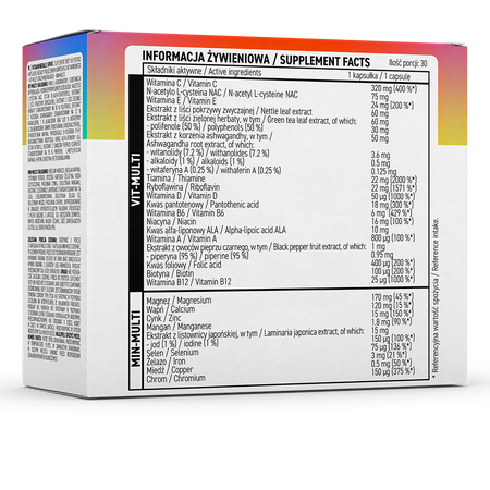 VIT-MULTI SKŁADNIKI: Kwas L-askorbinowy, substancja wypełniająca: hydroksypropylometyloceluloza, N-acetylo L-cysteina NAC, octan DL-alfa-tokoferylu, ekstrakt z liści pokrzywy zwyczajnej, ekstrakt z liści zielonej herbaty standaryzowany na 50% polifenoli, ekstrakt z korzenia ashwagandhy standaryzowany na 7.2% witanolidów, 1% alkaloidów oraz 0.25% witaferyny A, chlorowodorek tiaminy, ryboflawina, cholekalcyferol, D-pantotenian wapnia, pirydoksalo 5’-fosforan P-5-P, heksanikotynian inozytolu, kwas alfa-liponowy ALA, octan retinylu, ekstrakt z owoców pieprzu czarnego standaryzowany na 95% piperyny, L-metylofolian wapnia L-5-MTHF, D-biotyna, metylokobalamina.