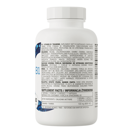 OstroVit Witamina B1 Tiamina to wysokiej jakości suplement diety, który stanowi źródło tiaminy. To preparat dostępny w postaci łatwych do połknięcia kapsułek, stworzony z myślą o osobach, którym zależy na uzupełnieniu codziennej diety w cenny mikroskładnik.