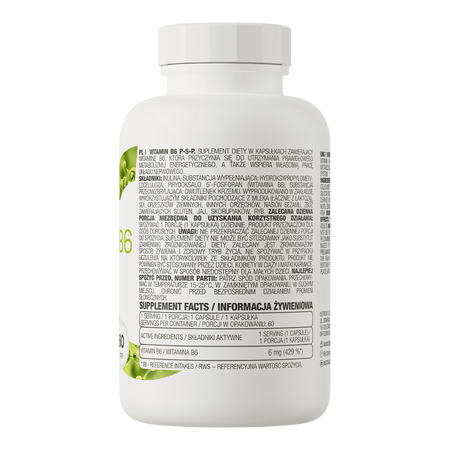 - Źródło witaminy B6 - jedna porcja suplementu diety dostarcza do organizmu 6 mg witaminy B6 w postaci pirydoksalu-5’-fosforanu.