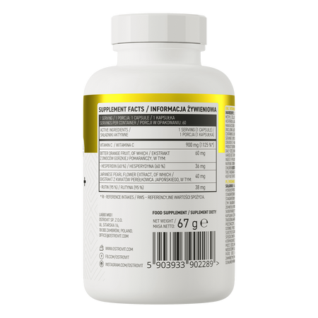 - Źródło trzech cennych związków - jedna porcja suplementu diety dostarcza do organizmu 900 mg witaminy C, a także 60 mg ekstraktu z owoców gorzkiej pomarańczy standaryzowanego na 60% hesperydyny oraz 40 mg ekstraktu z kwiatów perełkowca japońskiego standaryzowanego na 95% rutyny.