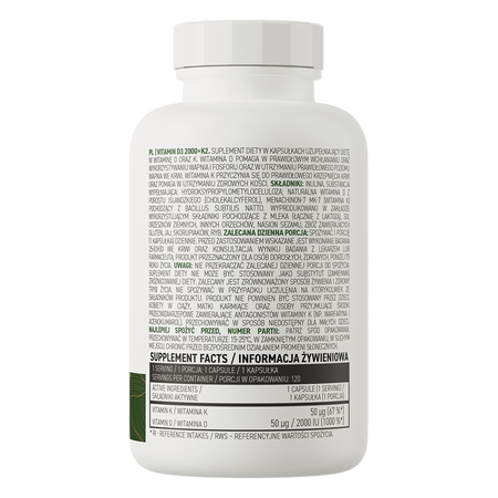 - Źródło witaminy D3 oraz K2 - jedna porcja suplementu diety zawiera 2000 IU cholekalcyferolu oraz 50 μg menachinonu-7-MK-7.