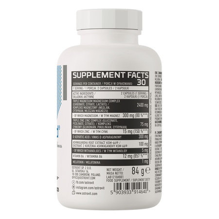 - Zestaw cennych składników - jedna porcja suplementu diety dostarcza do organizmu 2400 mg kompleksu magnezowego, a także 75 mg kompleksu cynkowego. Dodatkowo preparat zawiera 300 mg kwasu D-asparaginowego, 100 mg ekstraktu z korzenia ashwagandhy standaryzowanego na 5% witanolidów oraz 12 mg witaminy B6 i 1 mg melatoniny.