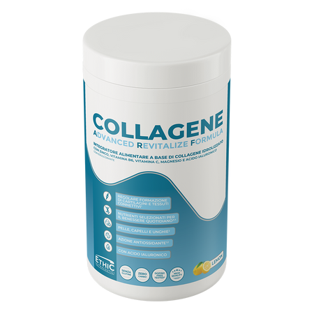 Ethic Nutraceutici Collagene - это комплексная пищевая добавка в виде порошка с лимонным вкусом, сочетающая в себе высококачественный гидролизованный бычий коллаген с витаминами, минералами и гиалуроновой кислотой. Продукт был разработан для физически активных людей, а также для тех, кто хочет дополнить свой рацион ценными ингредиентами.