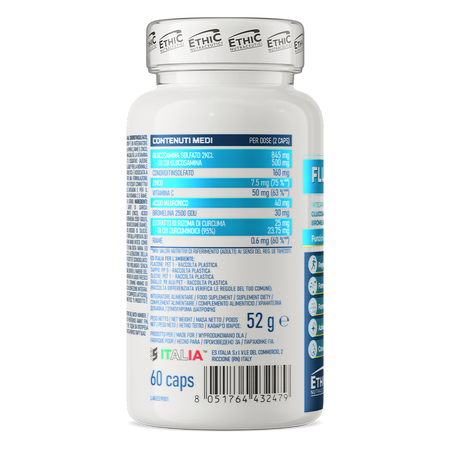 Ethic Nutraceutici Fluid Motion содержит, среди прочего, сульфат глюкозамина и хондроитина – соединения, естественно присутствующие в организме, а также гиалуроновую кислоту, которая является компонентом суставной жидкости. Бромелайн, как протеолитический фермент, и экстракт куркумы обеспечивают дополнительные растительные вещества. Формула дополнена ценными микроэлементами и витамином С, известным своим многосторонним значением для организма.