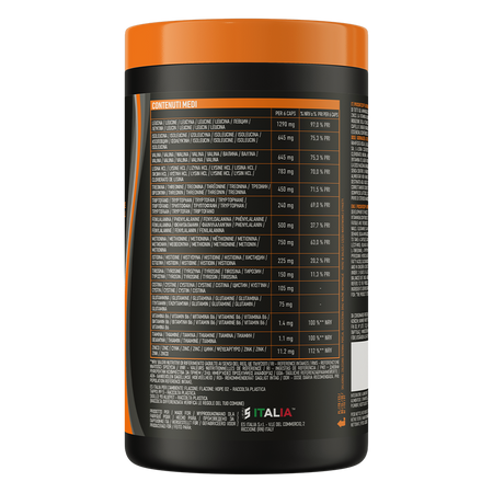 Разветвленные аминокислоты BCAA (L-лейцин, L-валин, L-изолейцин, эмульгатор: лецитин), L-лизин гидрохлорид, L-метионин, L-фенилаланин, L-треонин, L-триптофан, L-гистидин, L-тирозин, L-цистеин гидрохлорид, инулин, L-глутамин, пиколинат цинка (цинк), пиридоксин гидрохлорид (витамин B6), тиамин гидрохлорид (витамин B1), антислеживающие вещества: магниевые соли жирных кислот, диоксид кремния.