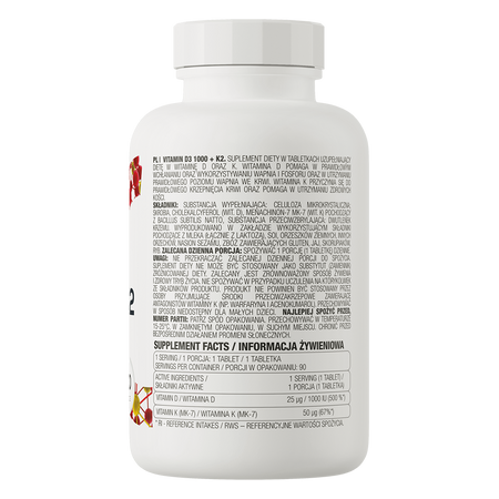 OstroVit Витамин D3 1000 МЕ + K2 90 это биологически активная добавка, которая содержит витамин D3 и витамин K2 MK-7 - форму соединения, наилучшим образом усваиваемую организмом человека. Это высококачественный препарат в виде легко проглатываемых таблеток, предназначенный для людей, желающих дополнить свой ежедневный рацион ценными компонентами.