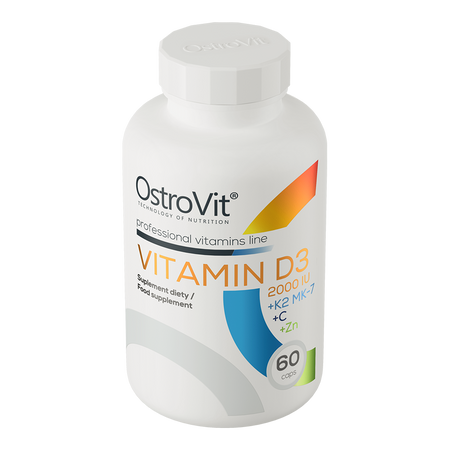 OstroVit Витамин D3 2000 МЕ + K2 MK-7 + C + Zn это комплексная биологически активная добавка, которая является источником ценных активных компонентов - витамина D3, витамина K2, а также витамина C и цинка. Она доступна в форме легко глотаемых капсул и разработана для людей, желающих дополнить свой ежедневный рацион ценными соединениями.