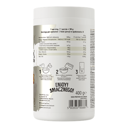 OstroVit Высокопротеиновое мороженое - это продукт в порошковой форме, который вы можете использовать для приготовления вкусного мороженого. Попробуйте один из предложенных вкусов (или сочетайте их) и создайте прохладительный, но в то же время сытный и богатый белком десерт! Мороженое с высоким содержанием белка OstroVit - это закуска, которая отлично подходит спортсменам и физически активным людям. Оно также является идеальным дополнением к меню тех, кто испытывает повышенную потребность в белке.