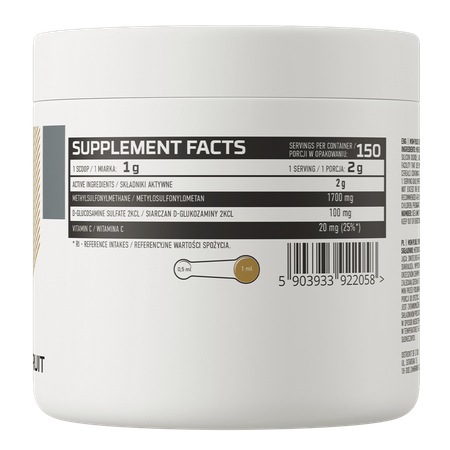 - Обогащен глюкозамином и витамином С - одна порция содержит 100 мг глюкозамина сульфата и 20 мг L-аскорбиновой кислоты.