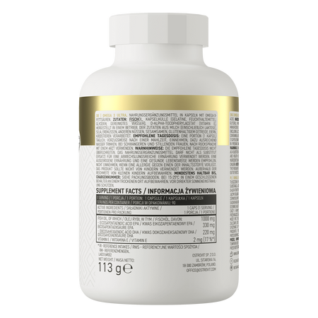 OstroVit Омега 3 Ultra 90 капсул это высококачественная биологически активная добавка, которая является источником омега-3 полиненасыщенных жирных кислот. В состав препарата входят такие соединения, как эйкозапентаеновая кислота (EPA), докозагексаеновая кислота (DHA), а также витамин Е. Продукт содержит высококонцентрированный рыбий жир, который выпускается в форме софтгелевых капсул.