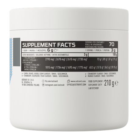 OstroVit Цитруллин высококачественная биологически активная добавка, которая содержит цитруллин малат. Это препарат с восхитительным вкусом жевательной резинки, выпускаемый в удобной порошковой форме и не содержащий сахара. Продукт предназначен для спортсменов и физически активных людей, желающих дополнить свой рацион ценными соединениями.