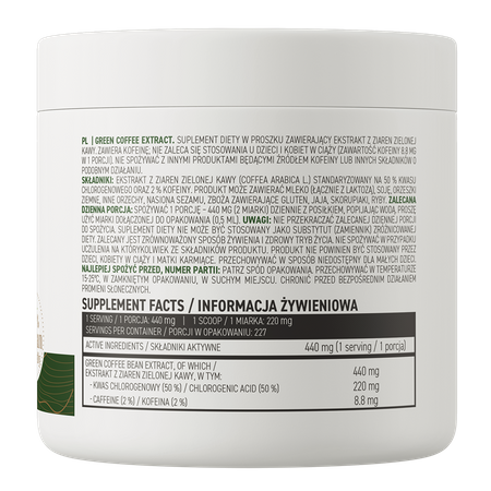OstroVit Экстракт зеленого кофе высококачественная пищевая добавка, которая содержит экстракт зеленых кофейных зерен, стандартизированный до 50% хлорогеновой кислоты и 5% кофеина. Это веганский препарат, доступный в удобной порошковой форме. Это продукт, предназначенный для людей, которые хотят стимулировать организм и дополнить свой ежедневный рацион ценными ингредиентами.