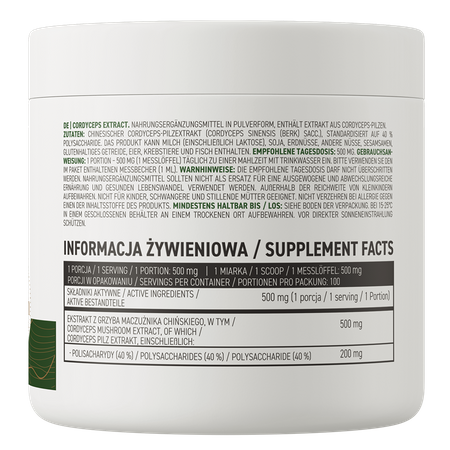 - Одна порция пищевой добавки обеспечивает организм 500 мг экстракта китайского кордицепса, стандартизированного до 40% полисахаридов.