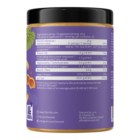 OstroVit 100% Peanut Powder это чистый арахис, измельченный в сыпучий порошок. Это полностью натуральный продукт, не содержащий никаких дополнительных веществ, сахара или соли. Сахар и соль, находящиеся в составе, естественным образом содержатся в арахисе. Это источник многих витаминов и минералов и, прежде всего, ненасыщенных жирных кислот. Чистый, ореховый вкус муки прекрасно подходит для выпечки хлеба, пирогов и омлетов. Кроме того, она хорошо сочетается как со сладкими, так и с солеными блюдами и, таким образом, широко применяется в повседневной кулинарии.