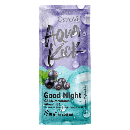 OstroVit Aqua Kick Good Night это биологически активная добавка, состоящая из трех компонентов: гамма-аминомасляной кислоты, витамина B6 и мелатонина. Это продукт с приятным вкусом черной смородины, выпускаемый в форме удобного пакетика, содержащего порошок, который прекрасно растворяется в воде. Это продукт, созданный для тех, кто заботится о правильном восстановлении сил и качественном сне.