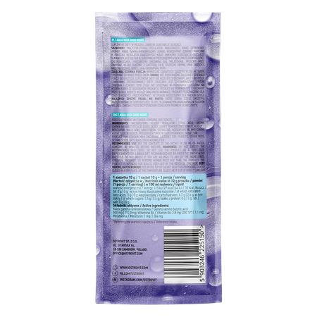 OstroVit Aqua Kick Good Night это биологически активная добавка, состоящая из трех компонентов: гамма-аминомасляной кислоты, витамина B6 и мелатонина. Это продукт с приятным вкусом черной смородины, выпускаемый в форме удобного пакетика, содержащего порошок, который прекрасно растворяется в воде. Это продукт, созданный для тех, кто заботится о правильном восстановлении сил и качественном сне.
