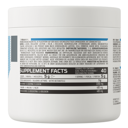 - Источник аминокислот с разветвленной цепью BCAA в соотношении 8:1:1 - одна порция пищевой добавки обеспечивает организм 3200 мг L-лейцинаа также 400 мг L-изолейцина и 400 мг L-валина.