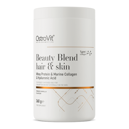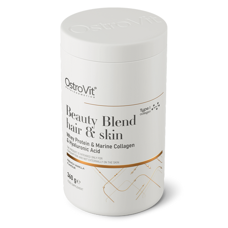 OstroVit Beauty Blend Hair & Skin комплексная биологически активная добавка, которая является источником белка, а также содержит коллаген, гиалуроновую кислоту, витамин С, витамин А, цинк и биотин. Это препарат с приятным ванильным вкусом, доступный в удобной порошковой форме. Это продукт без добавления сахара, который замечательно подходит для пополнения рациона людей, заботящихся о здоровом и красивом внешнем виде.