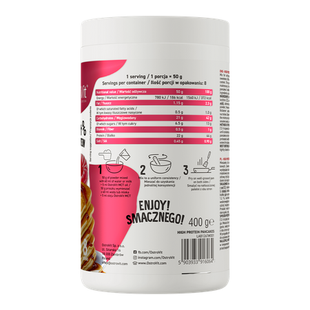 OstroVit High Protein Pancakes это смесь для самостоятельного приготовления блинов и протеиновых вафель, рекомендуемая, в частности, физически активным людям и спортсменам, испытывающим повышенную потребность в белке. Это богатый белком продукт, который без сомнений может быть использован и людьми, ведущими интенсивный образ жизни и желающими дополнить свой ежедневный рацион ценным макроэлементом. Приготовление ценного блюда с использованием OstroVit High Protein Pancakes занимает совсем немного времени и не требует специальных навыков. Блинчики или вафли можно употреблять как самостоятельное блюдо или сочетать с любимыми ингредиентами - фруктами, арахисовым маслом или низкокалорийным шоколадным кремом.