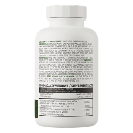 OstroVit KSM-66 Ашвагандха VEGE - высококачественная биологически активная добавка, содержащая экстракт корня ашвагандхи KSM-66, стандартизированный до 5% витанолидов. Это веганский препарат, доступный в форме легко глотаемых капсул. Продукт предназначен людям, желающим дополнить свой ежедневный рацион ценным ингредиентом.